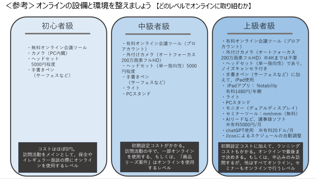 私は、自分のことをオンラインがすごいとか思っておりませんし、私よりオンライン面談に優れている方は複数おられます。そのため、私が「オンラインを語る」とは少しどうなのかなと思っておりましたが、今回のご質問者様のように、損保代理店にご勤務の方などには、オンライン面談は貴重な武器になり得ると感じたことと、これまで私なりにPDCAを回し、様々な改善をしてきたので、ここで一度、すべてをアウトプットしてみたくなったというのが、今回のシリーズで執筆をしてみようと思った背景です。