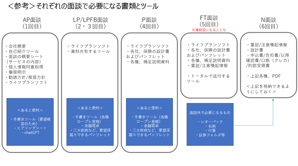 リアル面談における「対面影響力」は、とてつもない力があります。リアル面談では、この対面影響力が面談回数を下げる大きな効果をもっています。他方、オンラインには、この「対面影響力」が皆無です。これをどうリアル面談のそれ=対面影響力に近づけるかが大きなポイントとなり、私は6回が最適と考えています。また、上記で、LP(ライフプラン)としていますが、これは、初見でオンラインからスタートするときの面談を想定しているものであり、セミナーでの一度の接触がある面談などでは、このフェーズの面談回は割愛できるとも思います。つまり、初見の方では、ライフプラン提案をすることでお互いに接触時間を長く取るという理由もあります。